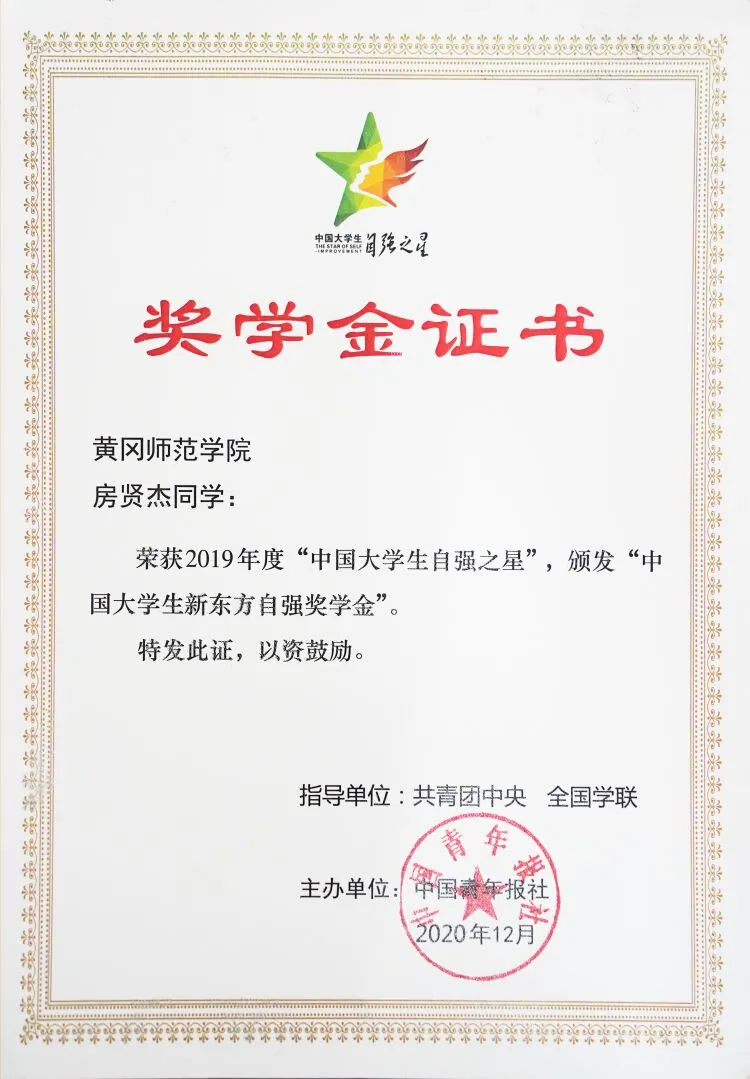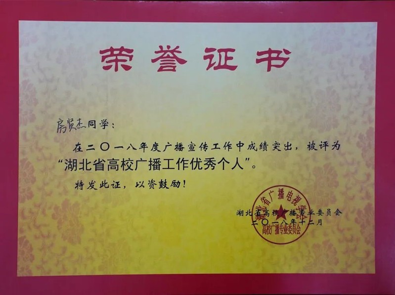 房贤杰先后担任校“黄师之声”广播台台长、新闻与传播学院学生会主席、团委副书记等职务。他曾获得2019年“中国大学生自强之星”、湖北省“创新、创意及创业”挑战赛一等奖、湖北省“挑战杯”大学生创业计划竞赛铜奖、湖北省高校广播工作优秀个人、全国教育人才优秀成果奖等六十余项各级荣誉。在他的故事里有奉献、有奋斗、有信念、有担当,更有着生生不息的青春力量。