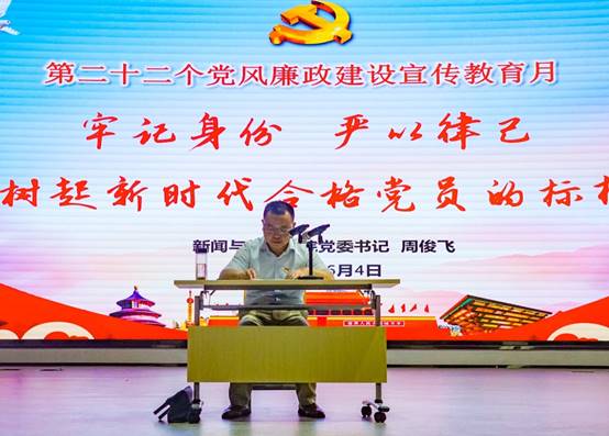 为扎实推进党风廉政建设,建设优秀的党员教师队伍,6月4日下午,bwin必赢在线登录入口在传媒楼演播厅举行第22个党风廉政宣传教育月党课宣讲活动。党委书记周俊飞作题为《牢记身份 严以律己 树起新时代合格党员的标杆》的专题廉政党课。学院全体党员教师以及坐班人员参加会议。