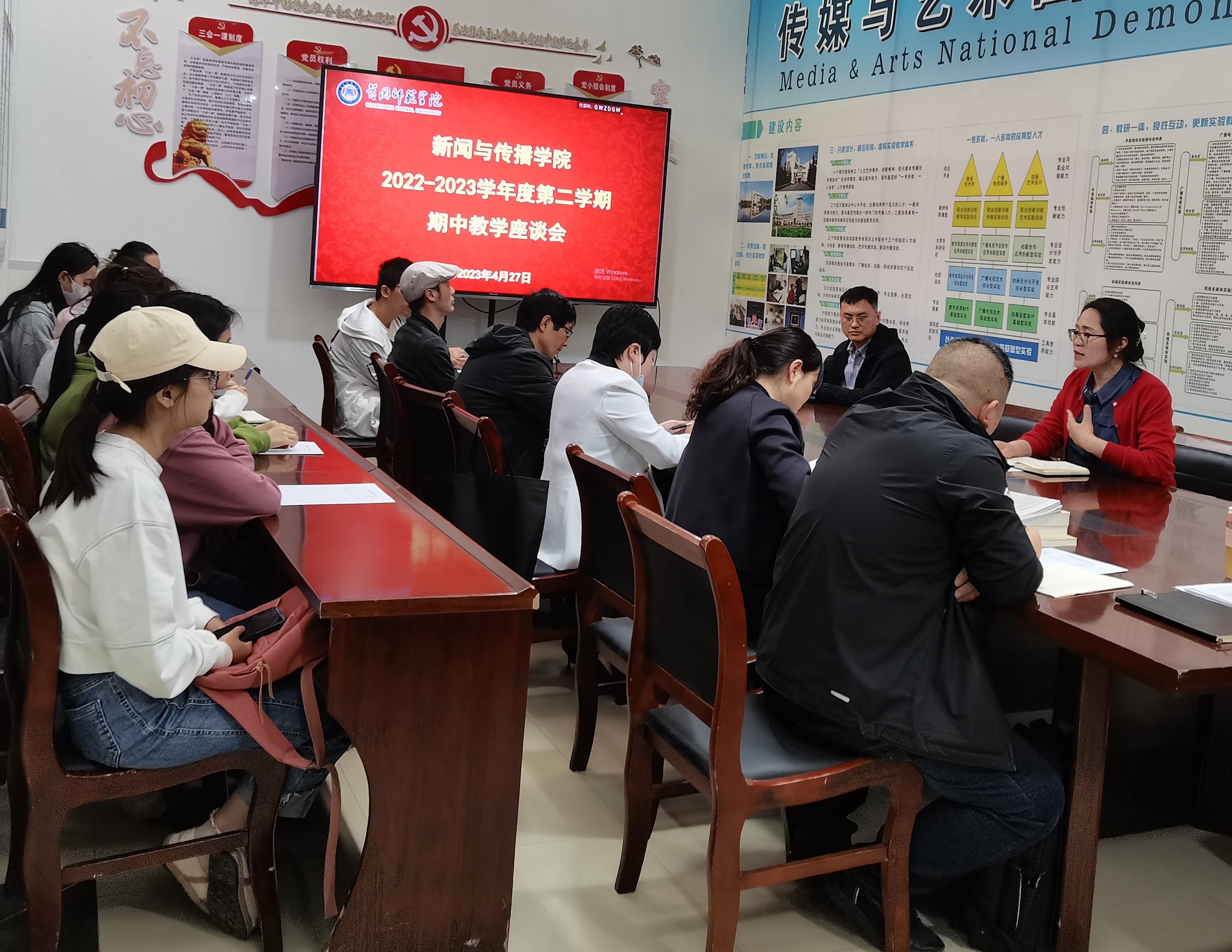 为保证教学工作的顺利开展和教学秩序的正常运行,及时发现、改进教学工作中存在的问题,促进学院的发展建设,新闻与传播学院于4月27日下午在传媒楼会议室召开了期中教学师生座谈会。学院分管教学副院长孙喜杰主持会议,各专业负责人、教研室主任、各教研室教师代表、各班级学生代表参加座谈会。