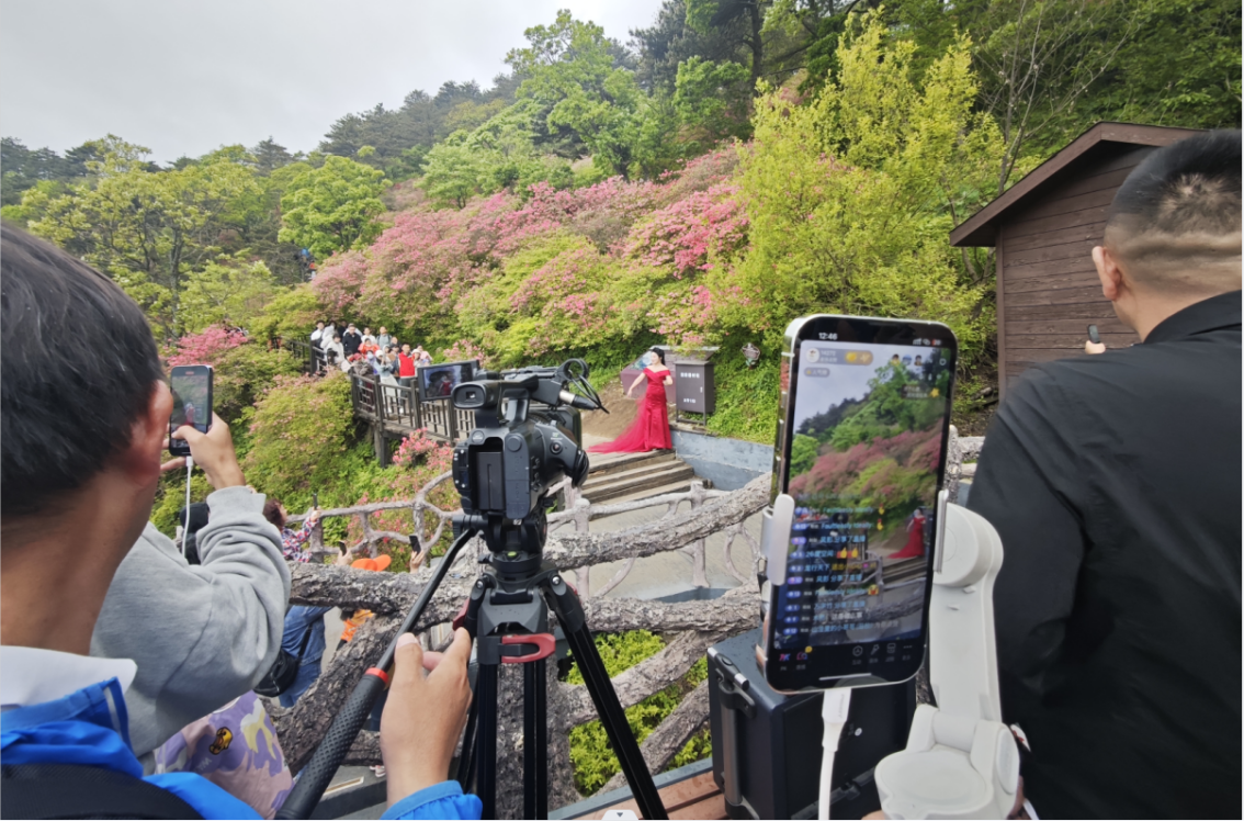 4月9日,数字经济学院因麻城龟峰山景点杜鹃花花期旅游直播带货项目前来传媒学院联系实习项目事宜。学院第一时间开展宣传招募,组建实习团队,召开实习动员会,成立工作领导小组,并委派方拥军带队编导2021级陶骉、梅艳晗、李舟、程培4名学生参加实习工作。从4月11日开始,4名实习生与数字经济学院直播带货专业团队一起扎根龟峰山,早出晚归,写策划、想文案、拍视频、剪视频、开直播,见证了次第开放的杜鹃和络绎不绝的游客,铸就了文旅IP的价值和传媒学子的风采。