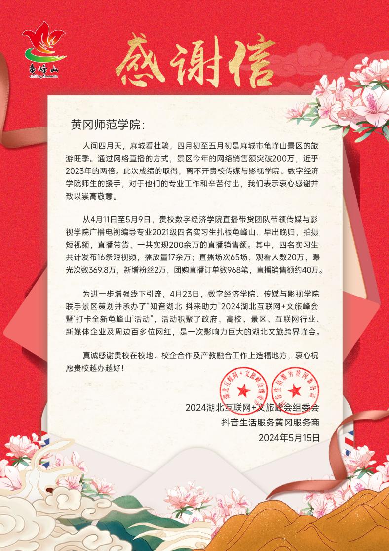 师生齐心,群策群力,每周复盘,集体的付出赢来了丰厚的回报。截止5月11日,团队一共实现200余万的直播销售额,其中,4名实习生共计发布16条短视频,播放量17余万;直播场次65场,观看人数20万,曝光次数369.8万,新增粉丝2万,团购直播订单数968笔,直播销售额约40万。5月20日,学院收到麻城龟峰山景点管理处、抖音生活服务商联名发来的感谢信,他们对学院师生的付出表示感谢。