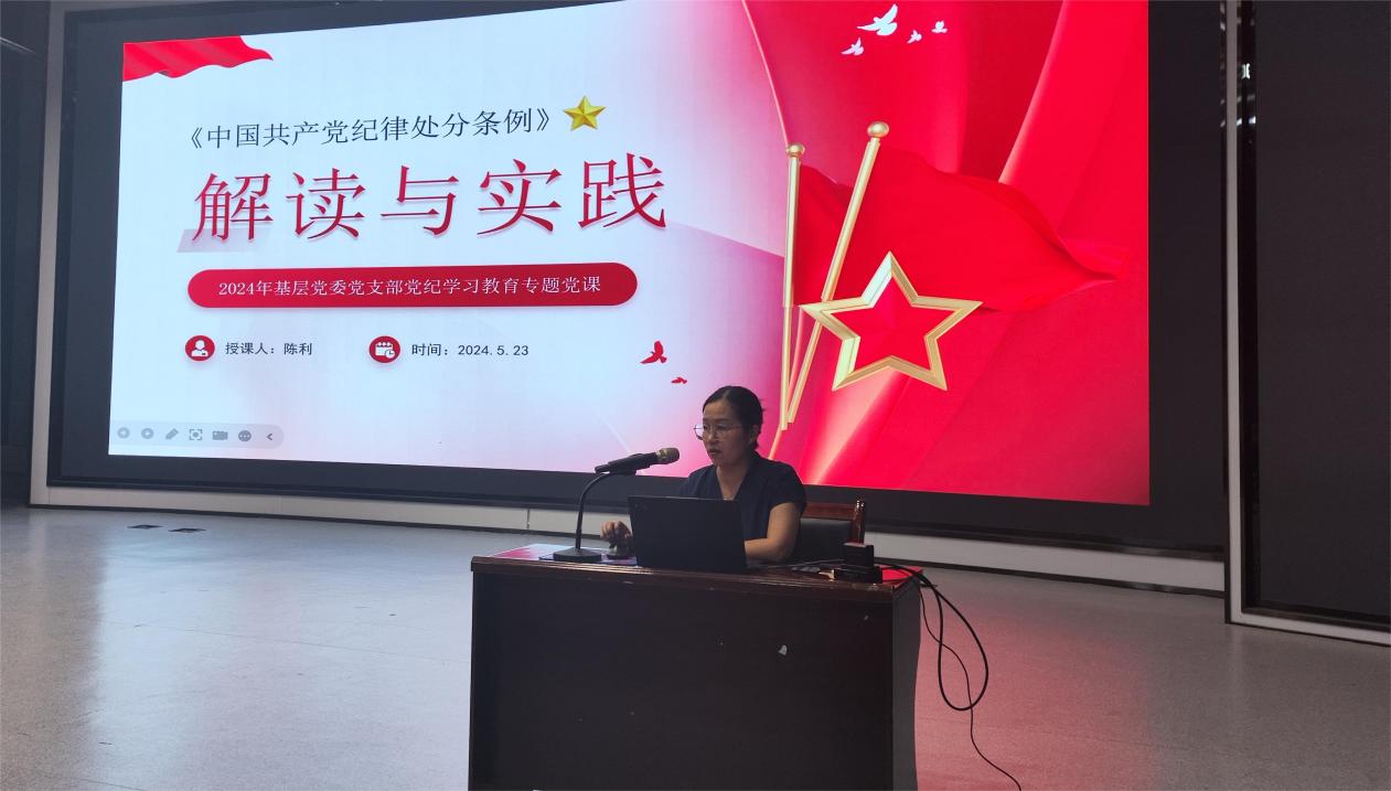 5月23日下午,学院党委书记陈利以《〈中国共产党纪律处分条例〉解读与实践》为题讲授党纪学习教育专题党课,学院党政班子成员、全体党员教职工参加学习。