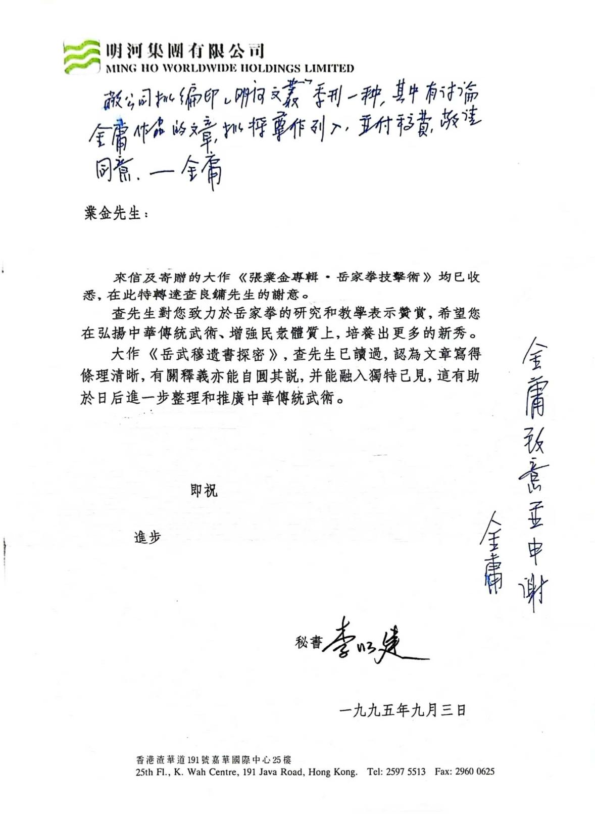 金庸生前致信张业金希望能公开发表《岳武穆遗书探秘》一文